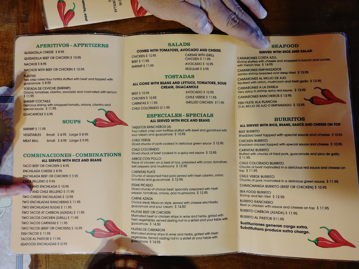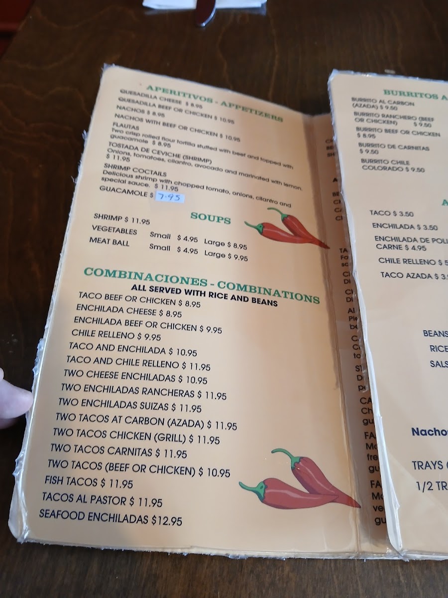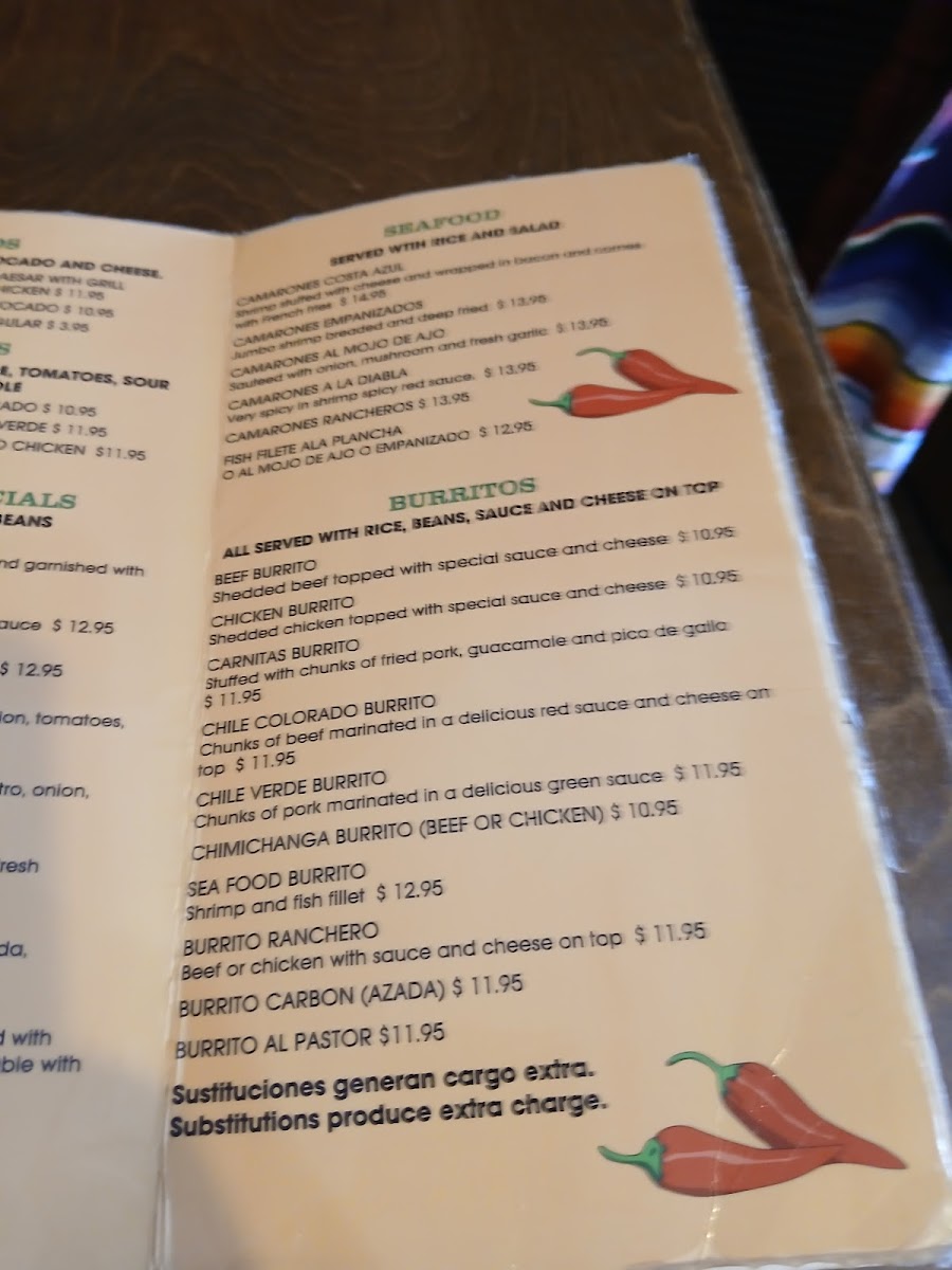 Marinated beef or chicken strips in wine and herbs, grilled with fresh vegetables served sizzling hot in a skillet and your table with guacamole. All served with rice and beans.