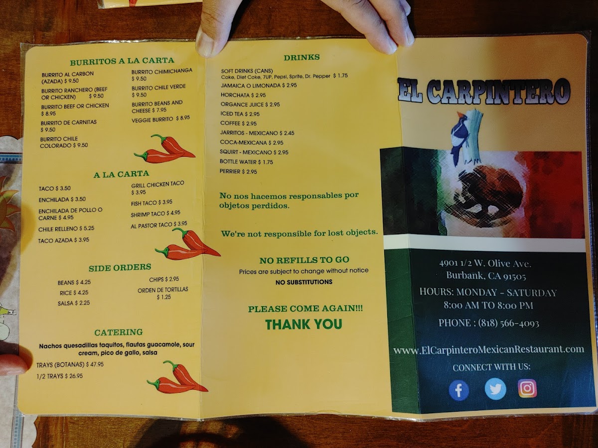 Four rolled crispy corn tortillas stuffed with beef and garnish with sour cream and guacamole. All served with rice and beans.